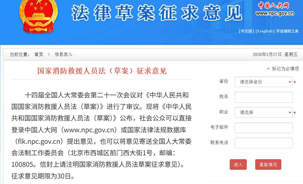 《中華人民共和國 消防救援人員法(草案)》已于2月27日公布,社會公眾可以直接登錄中國人大網(wǎng)或 法律法規(guī)數(shù)據(jù)庫提出意見,也可以將意見寄送全國人大常委會法制工作委員會(北京市西城區(qū)前門西大街1號,郵編:100805。信封上請注明 消防救援人員法草案征求意見)。